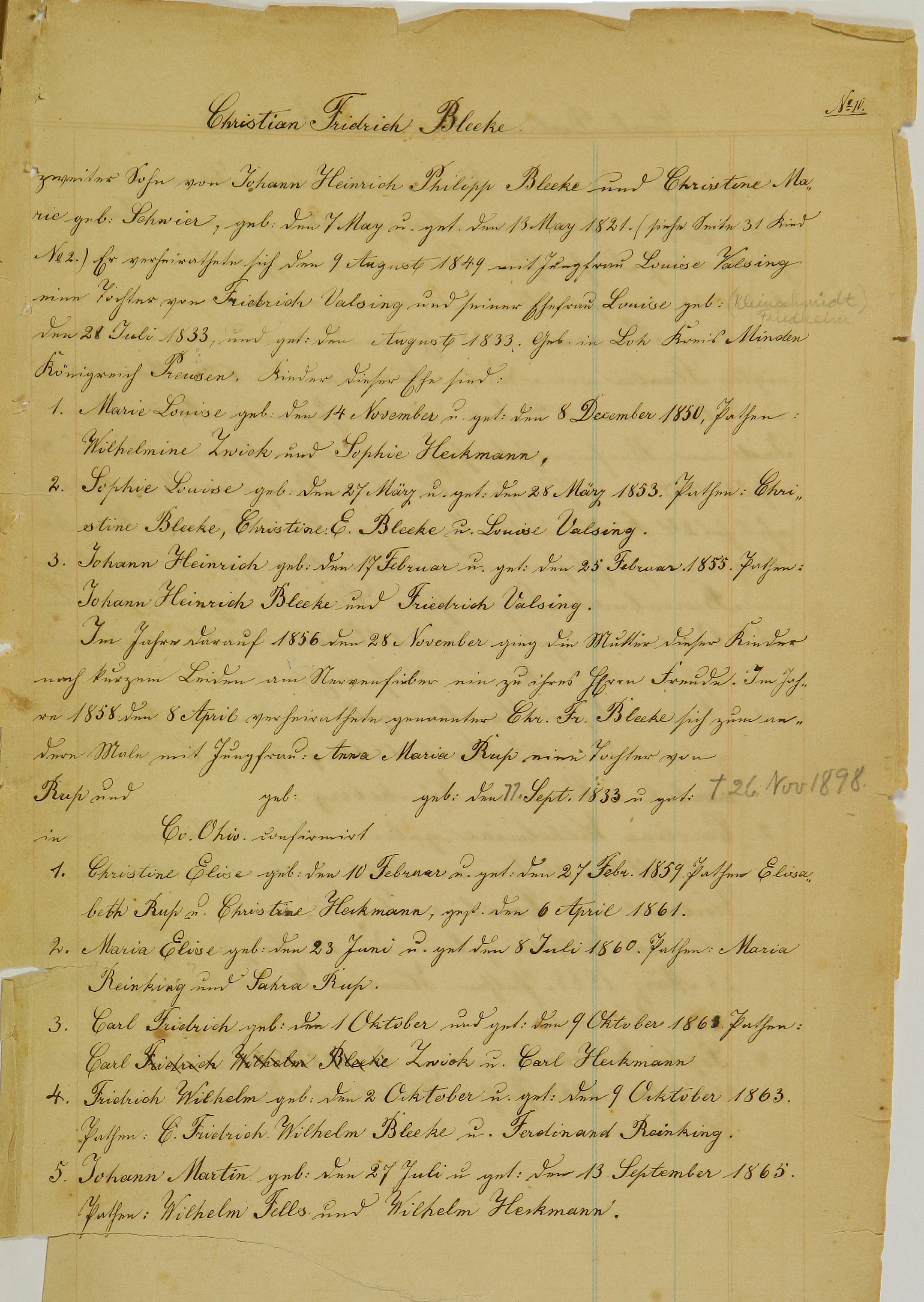 zweiter Sohn von Johann Heinrich Philipp Bleeke und Christine Marie neé Schwier, geb. den 7. Mai und get. den 13. Mai 1821 (siehe Seite 31, Kind No.2). Er verheiratete sich den 9. August 1849 mit Jungfrau Louise Valsing, eine Tochter von Friderich Valsing und seiner Ehefrau Louise geb. (in pencil: Kleinschmidt Friedheim) den 28. Juni 1833, und get. den [empty] August 1833. Geb. in Loh (now: Am Loh) Kreis Minden, Königreich Preussen.