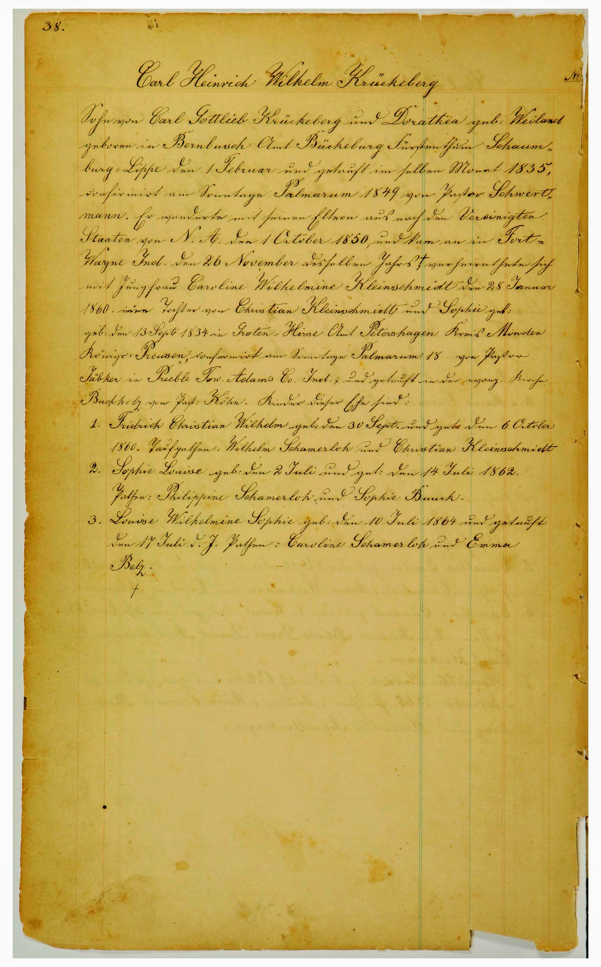 No. ? Sohn von Carl Gottlieb Krückeberg und Dorathea geb. Weiland geboren in Bernbursch (Berenbusch) Amt Bückeburg Fürstenthum Schaumburg-Lippe den 1 Februar und getauft im selben Monat 1835, confirmiert am Sonntage Palmarum 1849 von Pastor Schwertmann. Er wanderte mit seinen Eltern aus nach den Vereinigten Staaten von N.A. den 1 Oktober 1850, und kam an in Fort Wayne Ind. den 26 November desselben Jahres *. Verheirathete sich mit Jungfrau Caroline Wilhelmine Kleinschmidt den 28 Januar 1860, eine Tochter von Christian Kleinschmidt und Sophie, geb. den 13 Sept 1834 in Groten-Hirse (now: Großenheerse) Amt Petershagen, Kreis Minden, Königr. Preusen und getauft in der evang. Kirche Buchholz von Past. Köhn; confirmiert am Sonntage Palmarum 18(blank) von Pastor Jäbker in Preeble Tow. Adams Co. Ind. Kinder dieser Ehe sind: 1. Friedrich Christian Wilhelm, geb. den 30 Sept. und get. den 6 October 1860. Taufpaten: Wilhelm Schamerloh und Christian Kleinschmidt 2. Sophie Louise, geb. den 2 Juli und get. den 14 Juli 1862. Pathen: Philippine Schamerloh und Sophie Buuck 3. Louise Wilhelmine Sophie, geb. den 10 Juli 1864 und getauft den 17 Juli d.J. Pathen: Caroline Schamerloh und Emma Belz * [blank space]