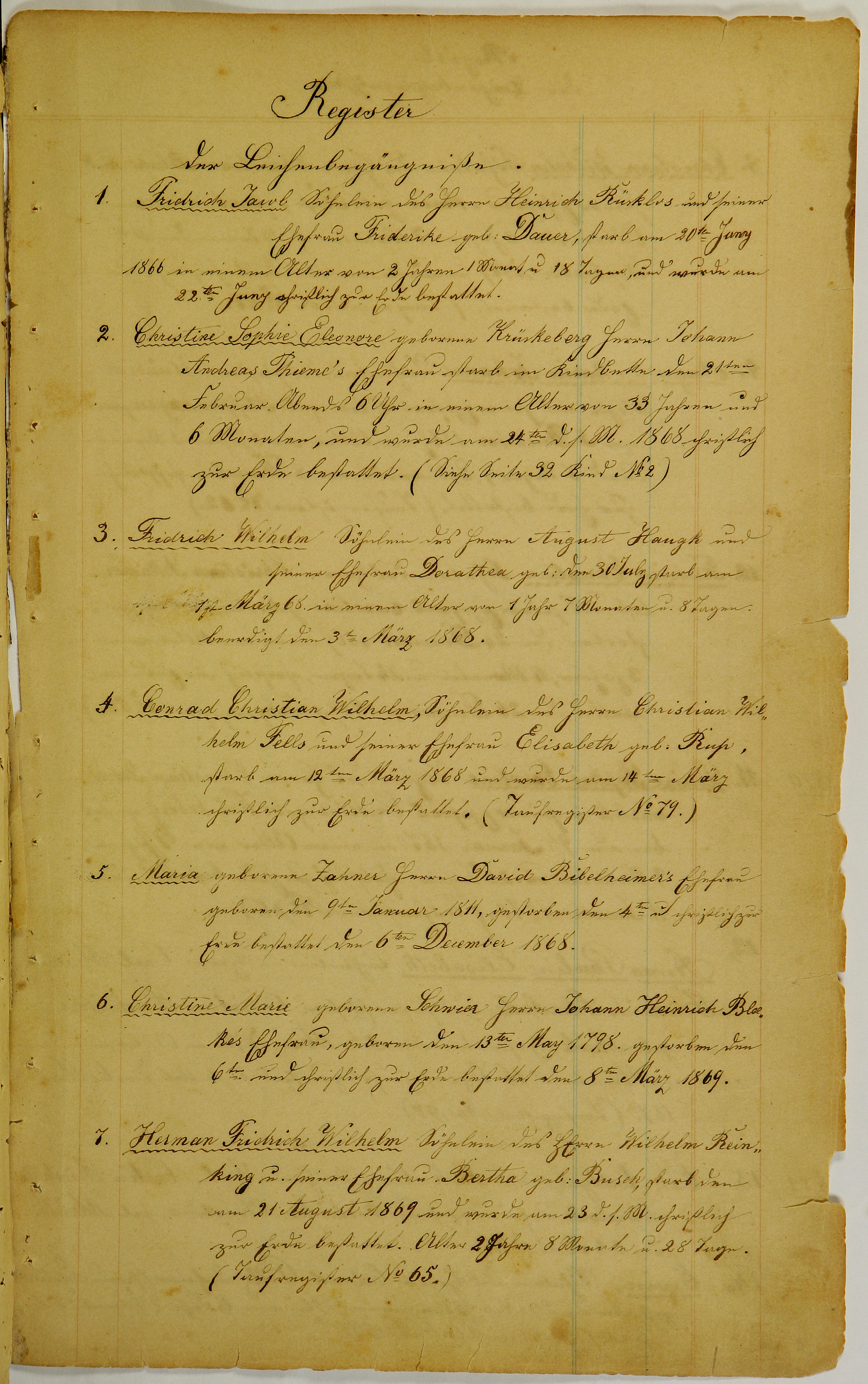 Christine Marie, née Schwier, wife of Mr. Johann Heinrich Bleekes, born on May 13, 1798, died on and was buried in a Christian burial on March 8, 1869.