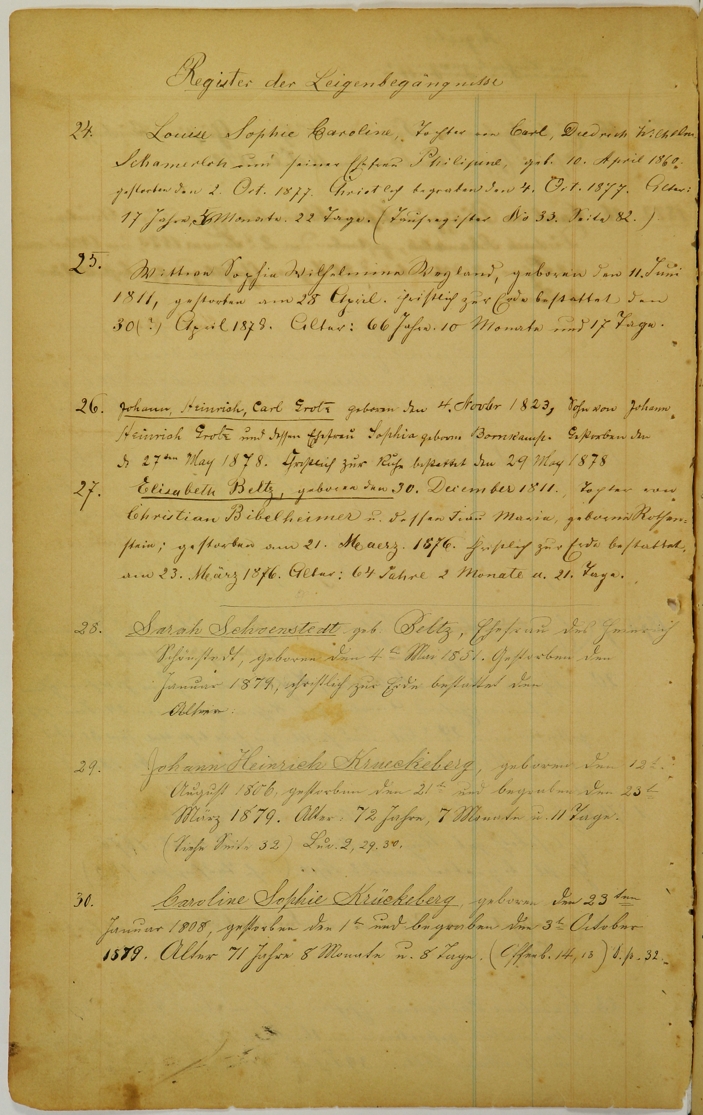 Caroline Sophie Krückeberg, born on January 23, 1808, died on October 1, and buried on October 3, 1879. Age 71 years, 8 months, and 8 days (Revelation 14:13) See p. 32.