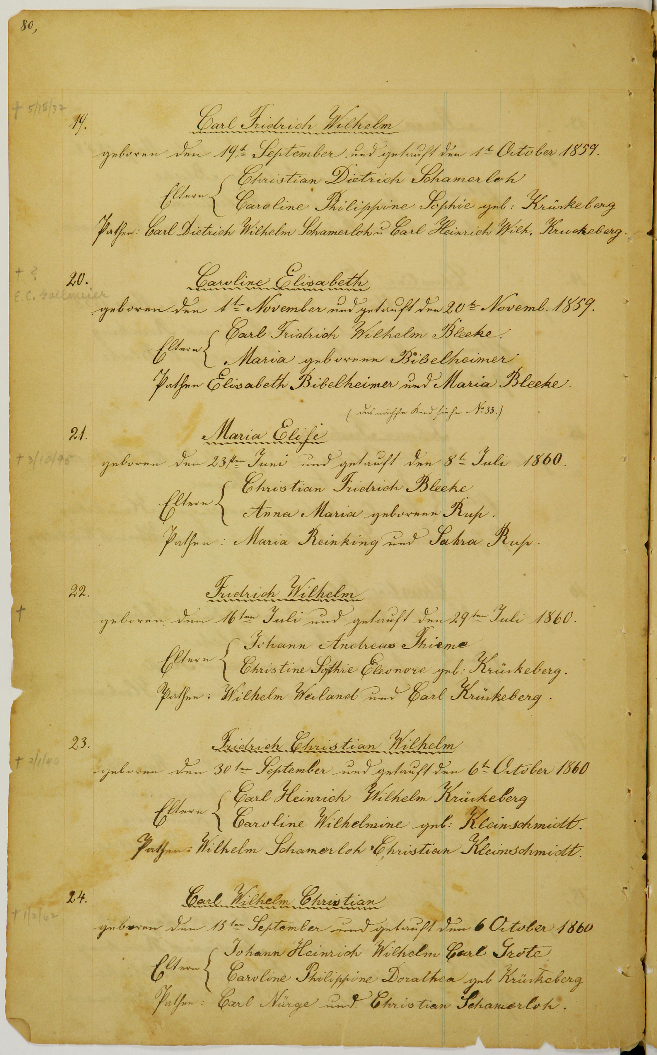Page 80, #19-24 Figure 1. Page 80, image 49 (Click to enlarge) Taufregister Transliteration Translation [+5/18/32] Carl Fridrich Wilhelm geboren den 19ten September und getauft den 1t October 1859. Eltern: Christian Dietrich Schamerloh Caroline Philippine Sophie geb. Krückeberg Pathen: Carl Dietrich Wilhelm Schamerich u. Carl Heinrich Wilh. Kruckeberg. [+?] Caroline Elisabeth [E.C. Gallmeier] geboren den 1ten November und getauft den 20t Novemb. 1859. Eltern: Carl Fridrich Wilhelm Bleeke. Maria geborene Bibelheimer Pathen: Elisabeth Bibelheimer und Maria Bleeke. (Dies nächste Kind siehe No 33.) Maria Elise [+3/10/95] geboren den 23ten Juni und getauft den 8t Juli 1860. Eltern: Christian Fridrich Bleeke Anna Maria geborene Rup. Pathen: Maria Reinking und Sahra Rup. Fridrich Wilhelm [+] geboren den 16ten Juli und getauft den 29den Juli 1860. Eltern: Johann Andreas Thieme Christine Sophie Eleonore geb. Krückeberg. Pathen: Wilhelm Weiland und Carl Krüskeberg. Fridrich Christian Wilhelm [+2/1/40] geboren den 30ten September und getauft den 6t October 1860 Eltern: Carl Heinrich Wilhelm Kräckeberg Caroline Wilhelmine geb: Kleinschmidt. Pathen: Wilhelm Schamerloh Christian Kleinschmidt. Carl Wilhelm Christian [+1/2/62] geboren den 15ten September und getauft den 6 October 1860 Eltern: Johann Heinrich Wilhelm Carl Grote Caroline Philippine Dorathea geb. Krückeberg Pathen: Carl Nürge und Christian Schamerloh. [+5/18/32] Carl Fridrich Wilhelm born on September 19th and baptized on October 1st, 1859. Parents: Christian Dietrich Schamerloh Caroline Philippine Sophie née Krückeberg Godparents: Carl Dietrich Wilhelm Schamerich and Carl Heinrich Wilh. Kruckeberg [+?] Caroline Elisabeth [E.C. Gallmeier] born on November 1st and baptized on November 20th, 1859. Parents: Carl Fridrich Wilhelm Bleeke. Maria née Bibelheimer Godparents: Elisabeth Bibelheimer and Maria Bleeke. (For the next child, see No. 33.) Maria Elise [+3/10/95] born on June 23rd and baptized on July 8th, 1860 Parents: Christian Fridrich Bleeke Anna Maria née Rup. Godparents: Maria Reinking and Sahra Rup. Fridrich Wilhelm [+] born on July 16th and baptized on July 29th, 1860. Parents: Johann Andreas Thieme Christine Sophie Eleonore née Krückeberg Godparents: Wilhelm Weiland and Carl Krückeberg. Fridrich Christian Wilhelm [+2/1/40] born on September 30th and baptized on October 6th, 1860 Parents: Carl Heinrich Wilhelm Krückeberg Caroline Wilhelmine née Kleinschmidt. Godparents: Wilhelm Schamerloh Christian Kleinschmidt. Carl Wilhelm Christian [+1/2/62] born on September 15th and baptized on October 6th, 1860 Parents: Johann Heinrich Wilhelm Carl Grote Caroline Philippine Dorathea née Krückeberg Godparents: Carl Nürge and Christian Schamerloh. Citation [image49] "Immanuel Lutheran Church, Decatur, Indiana, Kichenbuch digital image repository", personally obtained from the church, Image 49 of 242 Page 79, #13-18 Page 81, #25-30
