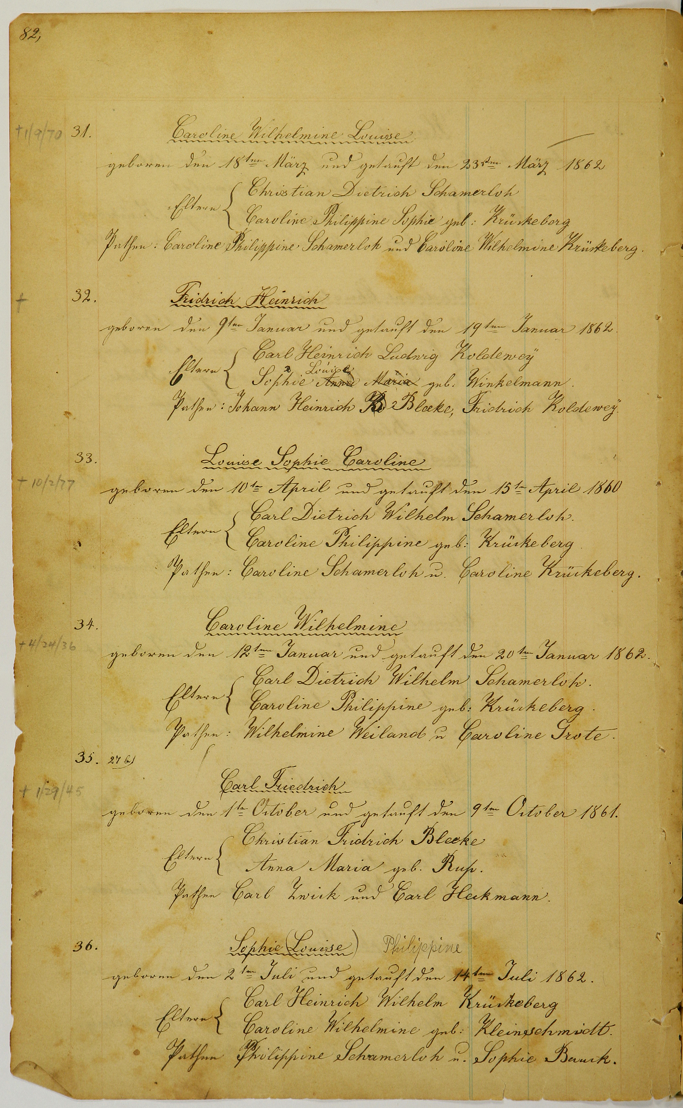 Page 82, #31-36 Figure 1. Page 82, image 51 (Click to enlarge) TODO: add Nachträge Transliteration Translation [+1/9/70] Caroline Wilhelmine Louise geboren den 18ten März und getauft den 23ten März 1862 Eltern: Christian Dietrich Schamerloh Caroline Philippine Sophie geb. Krückeborg Pathen: Caroline Philippine Schamerloh und Caroline Wilhelmine Krückeberg. [+] Friedrich Heinrich geboren den 9ten Januar und getauft den 19ten Januar 1862. Eltern: Carl Heinrich Ludwig Koldeweÿ Sophie Louise geb. Winkelmann Pathen: Johann Heinrich Bleeke, Fridrich Koldeweÿ Louise Sophie Caroline [+10/2/77] geboren den 10ten April und getauft den 15ten April 1860 Eltern: Carl Dietrich Wilhelm Schamerloh. Caroline Philippine geb. Krückeberg Pathen: Caroline Schamerloh u. Caroline Krückeberg. [+4/24/36] Caroline Wilhelmin geboren den 12ten Januar und getauft den 20ten Januaar 1862 Eltern: Carl Dietrich Wilhelm Schamerloh Caroline Philippe geb. Krückeberg. Pathen: Wilhelmine Weiland u Caroline Grote. [27 b] Carl Friedrich [+1/29/45] geboren den 1ten October und getauft den 9ten October 1861. Eltern: Christian Fridrich Blecke Anna Maria geb. Rup. Pathen Carl Zwick und Carl Heckmann. Sophie (Louise) Philippeine geboren den 2ten Juli und getauft den 14ten Juli 1862. Eltern: Carl Heinrich Wilhelm Krückeberg Caroline Wilhelmine geb. Kleinschmidt Pathen: Philippine Schamerloh u. Sophie Buuck. [+1/9/70] Caroline Wilhelmine Louise born on March 18 and baptized on March 23, 1862 Parents: Christian Dietrich Schamerloh Caroline Philippine Sophie née Krückeberg Godparents: Caroline Philippine Schamerloh and Caroline Wilhelmine Krückeberg. [+] Friedrich Heinrich born on January 9 and baptized on January 19, 1862. Parents: Carl Heinrich Ludwig Koldeweÿ Sophie Louise née Winkelmann Godparents: Johann Heinrich Bleeke, Friedrich Koldeweÿ Louise Sophie Caroline [+10/2/77] born on April 10 and baptized on April 15, 1860 Parents: Carl Dietrich Wilhelm Schamerloh. Caroline Philippine née Krückeberg Godparents: Caroline Schamerloh and Caroline Krückeberg. [+4/24/36] Caroline Wilhelmin born on January 12th and baptized on January 20th, 1862 Parents: Carl Dietrich Wilhelm Schamerloh Caroline Philippe née Krückeberg. Godparents: Wilhelmine Weiland and Caroline Grote. [27 b] Carl Friedrich [+1/29/45] born on October 1st and baptized on October 9th, 1861. Parents: Christian Fridrich Blecke Anna Maria née Rup. Godparents: Carl Zwick and Carl Heckmann. Sophie (Louise) Philippeine born on July 2nd and baptized on July 14th, 1862. Parents: Carl Heinrich Wilhelm Krückeberg Caroline Wilhelmine née Kleinschmidt Godparents: Philippine Schamerloh and Sophie Buuck. Page 81, #25-30 Page 83, #37-42