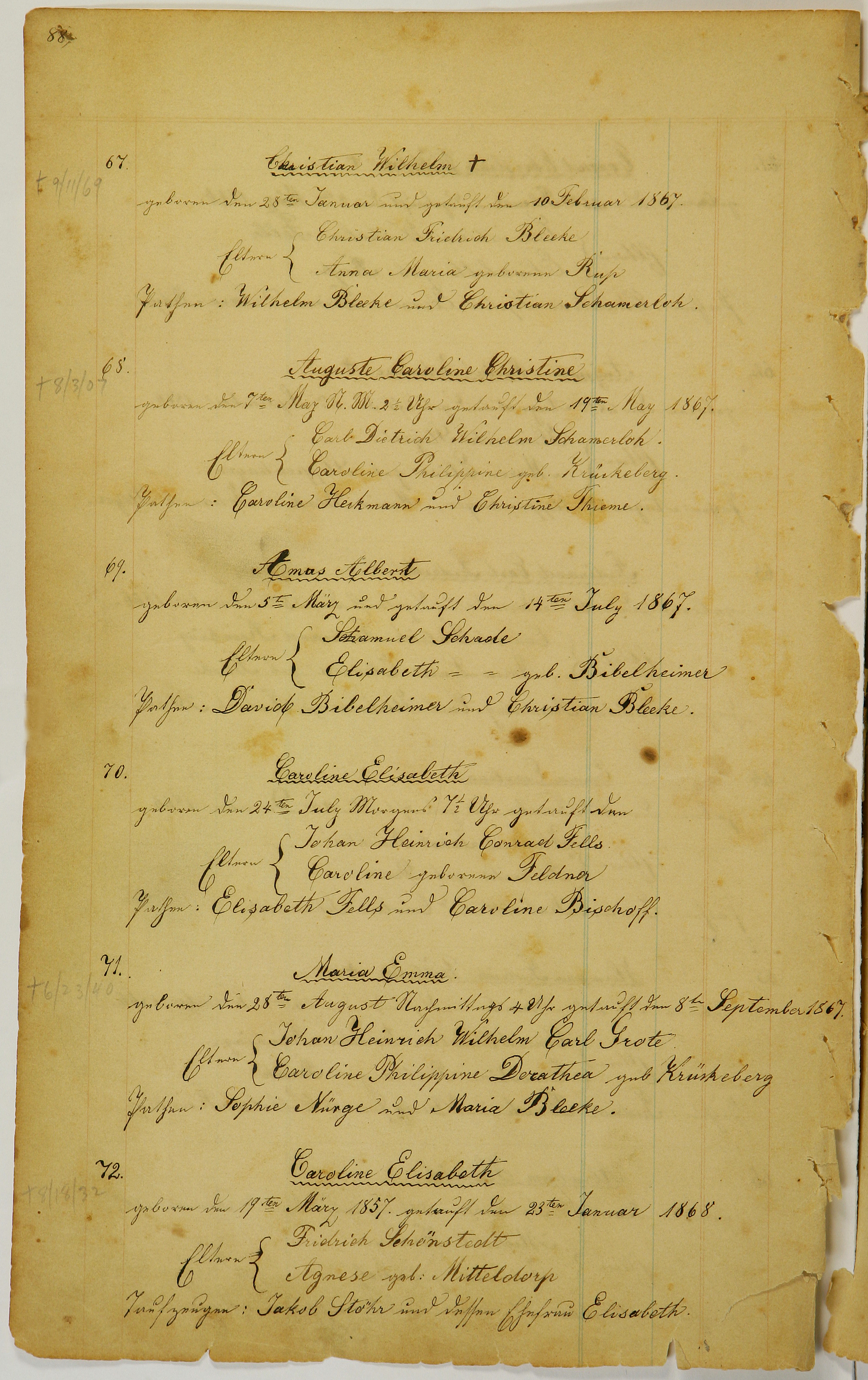 Page 88, #67-72 Figure 1. Page 88, image 57 (Click to enlarge) Transliteration Translation Christian Wilhelm [+9/11/69] geboren den 28ten Januar und getauft den 10 Februar 1867. Eltern: Christian Fridrich Bleeke Anna Maria geborene Rup Pathen: Wilhelm Bleeke und Christian Schamerloh Auguste Caroline Christine [+8/3/07] geboren den 7ten May St. M. 2 1/2 Uhr getauft den 19ten May Eltern: Carl Dietrich Wilhelm Schamerlok. Caroline Philippine geb. Krückeberg. S. Pathen: Caroline Heckmann und Christine Thieme. Amas Albert geboren den 5ten März und getauft den 14ten July 1867. Eltern: Samuel Schade Elisabeth geb. Bibelheimer Pathen: David Bibelheimer und Christian Bleeke. Caroline Elisabeth geboren den 24ten July Morgens 7 1/2 Uhr getauft den Eltern: Johan Heinrich Conrad Falls Caroline geborene Feldner Pathen: Elisabeth Falls und Caroline Bischoff. Maria Emma [+6/23/40] geboren den 28ten August Nachmittags 4 Uhr getauft den 8te September 1867 Eltern: Johan Heinrich Wilhelm Carl Grote Caroline Philippine Dorathea geb Krückeberg Pathen: Sophie Nürge und Maria Bleeke. Caroline Elisabeth [+8/18/32] geboren den 19ten März 1857. getauft den 23ten Januar 1868 Eltern: Fridrich Schönstedt Agnese geb. Mitteldorp Taufzeugen: Jakob Stöhr und dessen Ehefrau Elisabeth Christian Wilhelm [+9/11/69] geboren den 28ten Januar und getauft den 10 Februar 1867. Parents: Christian Fridrich Bleeke Anna Maria née Ru[ß/p] Godparents: Wilhelm Bleeke and Christian Schamerloh. Auguste Caroline Christine [+8/3/07] geboren den 7ten May St. M. 2 1/2 Uhr getauft den 19ten May Parents: Carl Dietrich Wilhelm Schamerloh. Caroline Philippine née Krückeberg. S. Godparents: Caroline Heckmann and Christine Thieme. Amas Albert born on March 5th and baptized on July 14th, 1867. Parents: Samuel Schade Elisabeth née Bibelheimer Godparents: David Bibelheimer and Christian Bleeke. Caroline Elisabeth born on July 24th at 7:30 a.m., baptized on Parents: Johan Heinrich Conrad Falls Caroline née Feldner Godparents: Elisabeth Falls and Caroline Bischoff. Maria Emma [+6/23/40] geboren den 28ten August Nachmittags 4 Uhr getauft den 8te September 1867 Parents: Johan Heinrich Wilhelm Carl Grote Caroline Philippine Dorathea née Krückeberg Godparents: Sophie Nürge and Maria Bleeke. Caroline Elisabeth [+8/18/32] geboren den 19ten März 1857. getauft den 23ten Januar 1868 Parents: Fridrich Schönstedt Agnese née Mitteldorp Witnesses: Jakob Stöhr and his wife Elisabeth Page 87, #61-66 Page 89, #73-78