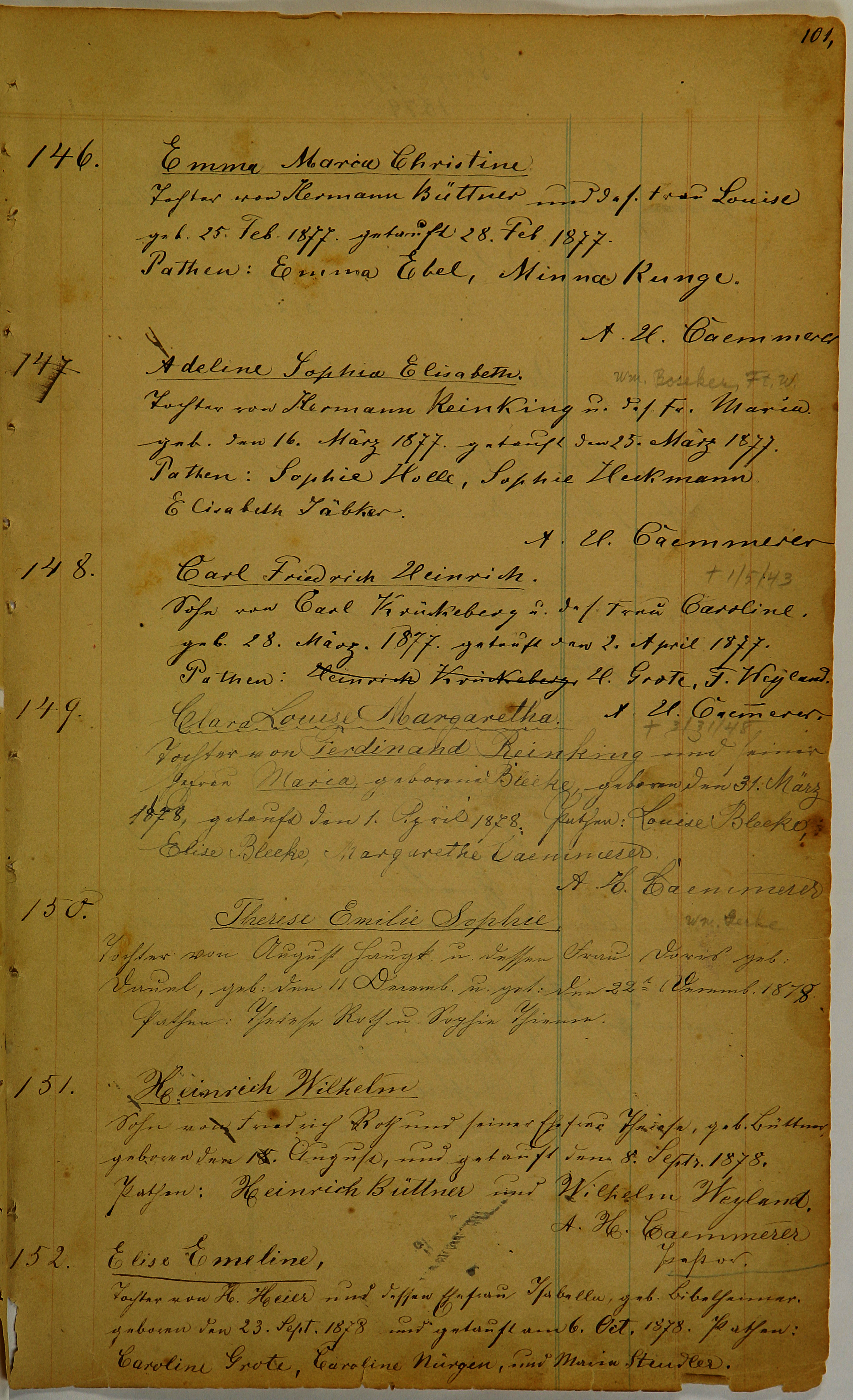 Godparents: Heinrich Büttner and Wilhelm Weyland.