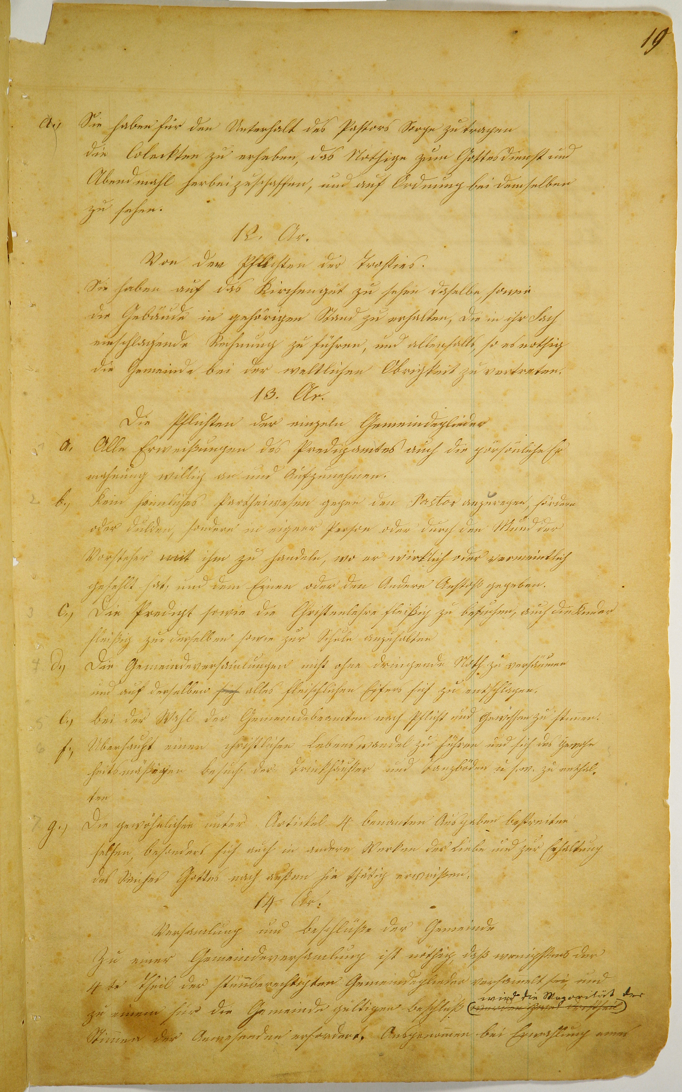 a. Sie haben für den Unterhalt des Pastors Sorge zu tragen die Coleckten zu erheben, das Nothige zum Gottesdienst und Abendmahl herbeizuschaffen, und auf Ordnung bei demselben zu sehen. 12. Ar. Von den Pflichten der Trosties. Sie haben auf das Kirchengut zu sehen daselbe, sowie die Gebäude in gehörigen Stand zu erhalten, die in ihr Fach einschlagende Rechnung zu führen, und allenfalls, so es nothig die Gemeinde bei der weltlichen Obrigkeit zu vertreten. 13. Ar. Die Pflichten der einzeln Gemeindeglieder a. Alle Erweißungen des Predigamtes auch die persönliche Er- mahnung willig an und Aufzunehmen. b. Kein heimliches Partheiwesen gegen den Pastor anzuregen, förden oder dulden, sondern in eigner Person oder durch den Mund der Vorsteher mit ihm zu handeln, wo er wirklich oder vermeintlich gefehlt hat, und dem Einen oder den Andere Anstoß gegeben. c. Die Predigt sowie die Christenlehre fleißig zu besuchen, auch die Kinder fleißig zur derselben sowie zur Schule angehalten. d. Die Gemeindeversamlungen nicht ohne dringende Noth zu versäumen und auf derselben alles fleischlichen Eifers sich zu entschlagen. e. bei der Wahl der Gemeindebeamten nach Pflicht und Gewissen zu stimmen. f. Überhaupt einen christlichen Lebenswandel zu führen und sich das gewohn heitsmäßigen Besuch der Trinkhäuser und Tanzböden u. s. w. zu enthalten. g. Die gewöhnlichen unter Artikel 4 benanten Ausgaben bestreiten helfen, besonders sich auch in andere Werken der Liebe und zur Erhaltung des Reiches Gottes nach außen hie thätig erweißen. 14 Ar. Versammlung und Beschlüße der Gemeinde Zu einer Gemeindeversammlung ist nöthig, daß wenigstens der 4te Theil der stimmberechtigten Gemeindeglieder versammelt sei, und zu einem für die Gemeinde gültigen Beschluß wird die Majorität der Stimmen der Anwesenden erfordert. Ausgenommen bei Erwählung eines [continues on next page]