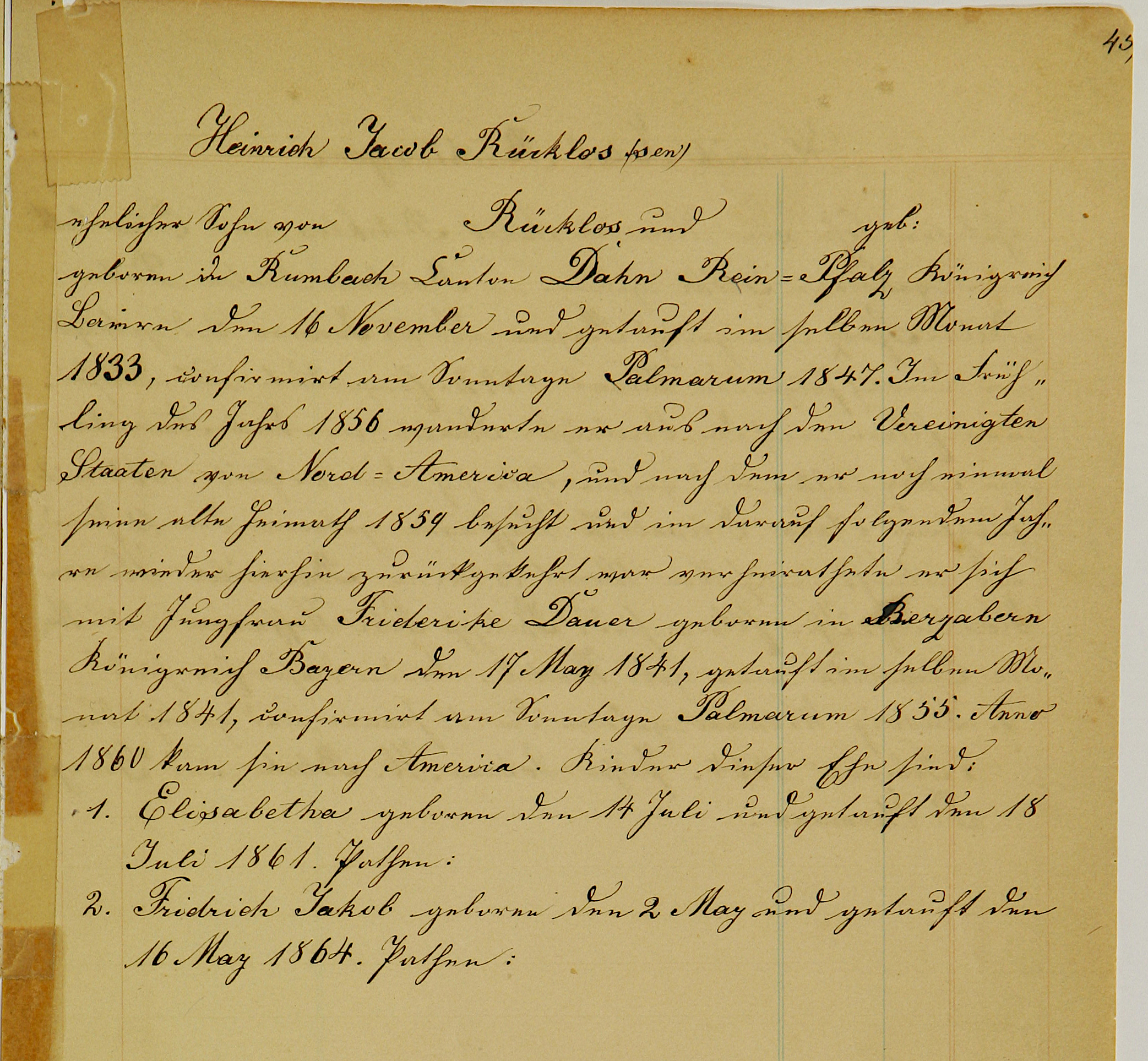 Geboren in Rumbach, Kanton Dahn, Rein-Pfalz, Königreich Baiern, den 16 November und getauft im selben Monat 1833, confirmiert am Sonntag Palmarum 1847. Im Frühling des Jahres 1856 wanderte er aus nach den Vereinigten Staaten von Nord-Amerika, und nachdem er noch einmal seine alte Heimat 1859 besucht und im darauf folgenden Jahr er wieder hierhin zurückgekehrt war, verheirathete er sich mit Jungfrau Friderike Dauer, geboren in Bergzabern Königreich Bayern den 17 Mai 1841, getauft im selben Monat 1841, confirmiert am Sonntage Palmarum 1855. Anno 1860 kam sie nach Amerika.