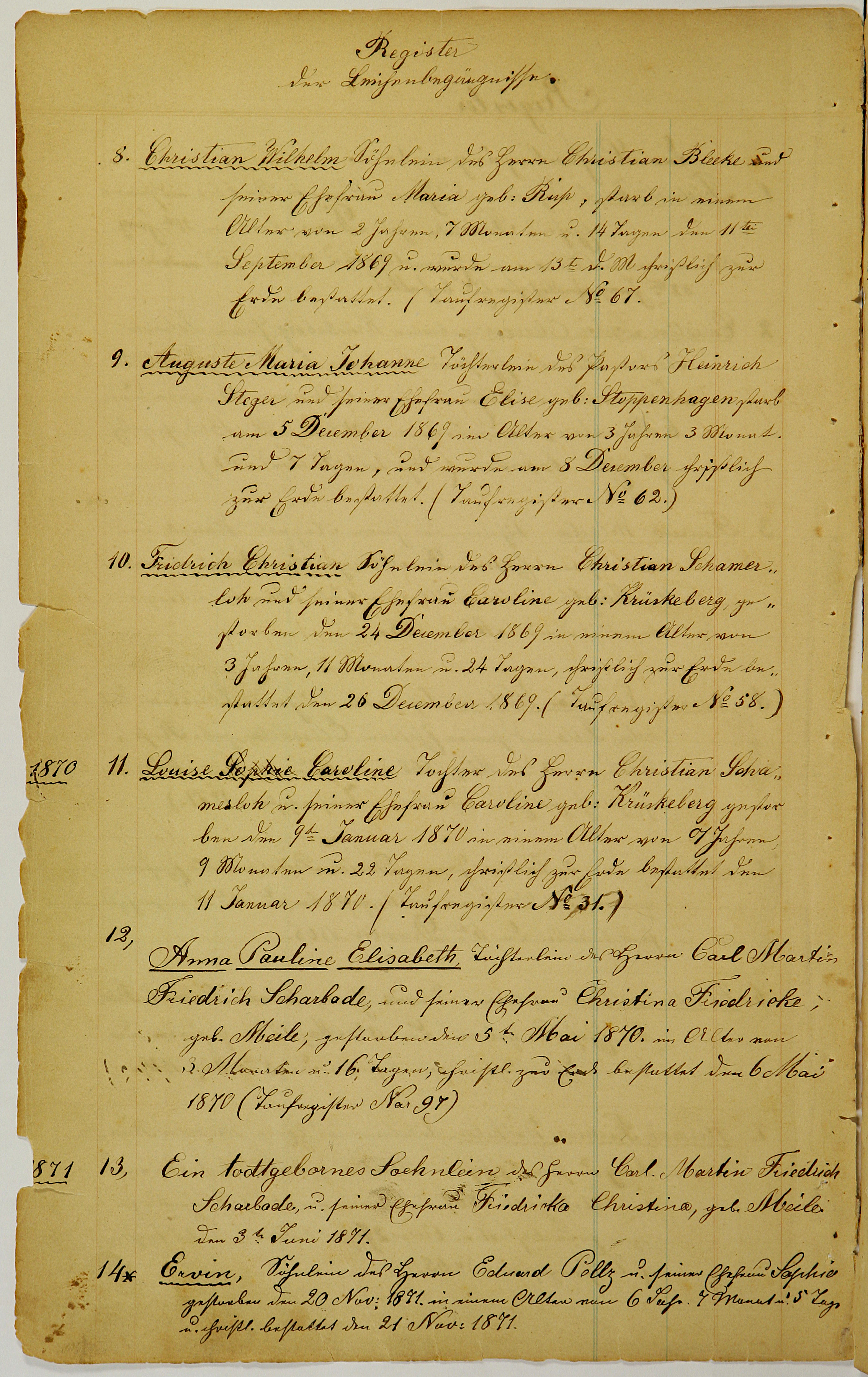 Louise Sophie Caroline Tochter des Herrn Christian Schamerloh \u. seiner Ehefrau Caroline geb. Krückeberg gestorben den 9ten Januar 1870 in einem Alter von 7 Jahren 9 Monaten u. 22 Tagen, christlich zur Erde bestattet den 11 Januar 1870. (Taufregister No 31.)