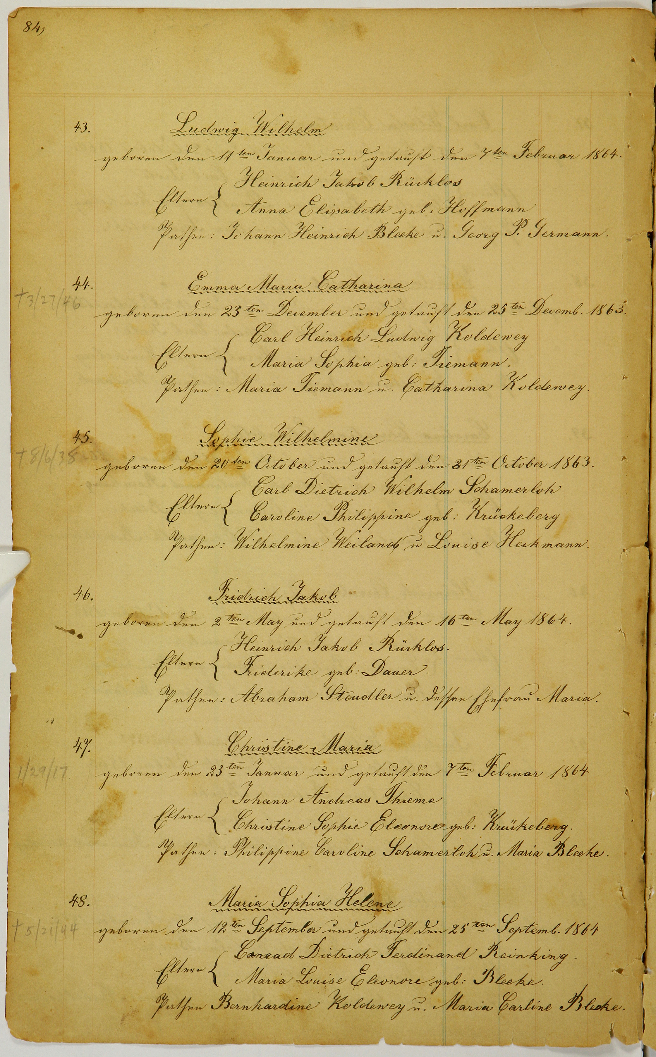 Page 84, #43-48 Figure 1. Page 84, image 53 (Click to enlarge) TODO: Add Nachträge Transliteration Translation Ludwig Wilhelm geboren den 11ten Januar und getauft den 7ten Februar 1864. Eltern: Heinrich Jakob Rücklos Anna Elisabeth geb. Hoffmann Pathen: Johann Heinrich Bleeke u. Georg P. Germann. Emma Maria Catharina geboren den 23ten December und getauft den 25ten Decemb. 1863. Eltern: Carl Heinrich Maria Sophia geb. Tiemann. Pathen: Maria Tiemann u. Catharina Koldewey. Sophie Wilhelmine geboren den 20ten October und getauft den 31ten October 1863. Eltern: Carl Dietrich Wilhelm Schamerloh Caroline Philippine geb: Krückeberg Pathen: Wilhelmine Weiland u. Louise Heckmann. Fridrich Jakob geboren den 2ten May und getauft den 16ten May 1864. Eltern: Heinrich Jakob Rücklos. L. Friderike geb. Dauer. Pathen: Abraham Stoudler u. dessen Ehefrau Maria. Christine Maria geboren den 23ten Januar und getauft den 7ten Februar 1864 Eltern: Johann Andreas Thieme Christine Sophie Eleonore geb. Krückeberg. Pathen: Philippine Caroline Schamerloh u. Maria Bleeke. Maria Sophia Helene geboren den 12ten September und getauft den 25ten Septemb. 1864 Eltern: Conrad Dietrich Ferdinand Reinking. Maria Louise Eleonore geb. Bleeke. Pathen Bernhardine Koldewey u. Maria Carline Bleeke Ludwig Wilhelm born on January 11th and baptized on February 7th, 1864. Parents: Heinrich Jakob Rücklos Anna Elisabeth née Hoffmann Godparents: Johann Heinrich Bleeke and Georg P. Germann. Emma Maria Catharina born on December 23rd and baptized on December 25th, 1863. Parents: Carl Heinrich Maria Sophia née Tiemann. Godparents: Maria Tiemann and Catharina Koldewey. Sophie Wilhelmine born on October 20th and baptized on October 31st, 1863. Parents: Carl Dietrich Wilhelm Schamerloh Caroline Philippine née Krückeberg Godparents: Wilhelmine Weiland and Louise Heckmann. Fridrich Jakob born on May 2nd and baptized on May 16th, 1864. Parents: Heinrich Jakob Rücklos. L. Friderike née Dauer. Godparents: Abraham Stoudler and his wife Maria. Christine Maria born on January 23rd and baptized on February 7th, 1864 Parents: Johann Andreas Thieme Christine Sophie Eleonore née Krückeberg. Godparents: Philippine Caroline Schamerloh and Maria Bleeke. Maria Sophia Helene born on September 12th and baptized on September 25th, 1864 Parents: Conrad Dietrich Ferdinand Reinking. Maria Louise Eleonore née Bleeke. Godparents: Bernhardine Koldewey and Maria Carline Bleeke